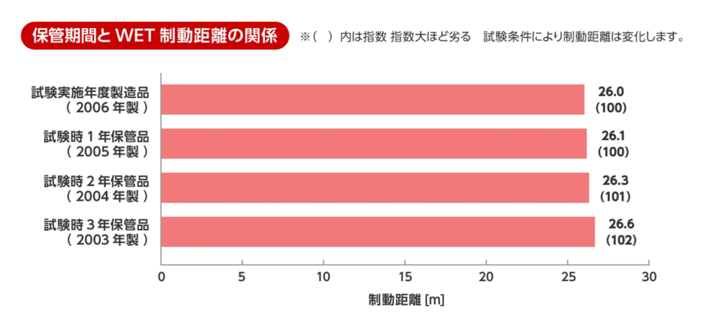 タイヤメーカー各社の実験データでも、直射日光や湿気を避けた倉庫で保管されたタイヤは、3年間は新品時と同等の性能を維持することが証明されています。