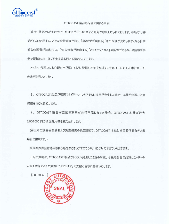 📣「OTTOCAST製品の保証に関する声明」
