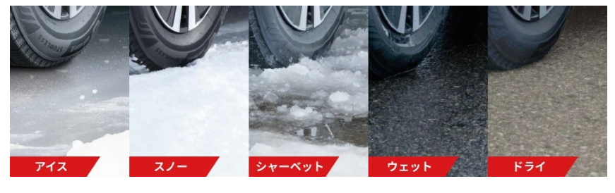 コンパウンドの改良により耐久性が上がり、シーズンをまたいでも性能低下が緩やか。特に走行距離が多い人に安心材料となっています。従来型に比べて、プラスもう一年長持ちする!が狙いらしい。 - 雪深いシーンでの安心感